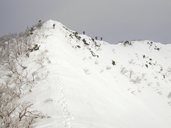 | ここから野田ヶ山までが今回の核心部である。ブッシュのまばらな雪壁を急下降する。すぐ出会う小さなコブは右をまく。次の大きなピーク(親指ピーク)も右の急な雪壁をまく。このあたりからの三鈷峰、いやいや堂々たる風格です。思わずおっー、と歓声をあげました。 痩せた稜線に戻ると次は2m程の岩場。スタンスきめてよじ登ればほんの数mであるが、幅30cmほどの刃渡り。土の上に雪が1m程ブロック状で載っているので平均台を歩くような感じである。皆さんの意見ではここが1番気持ち悪かったそうな。更に続くやせた稜線をたどれば野田ヶ山とのコル。一登りで野田ヶ山。ここまでの稜線、所々右手に1m程の雪庇が出ているのでルート選定に注意が必要である。 |
