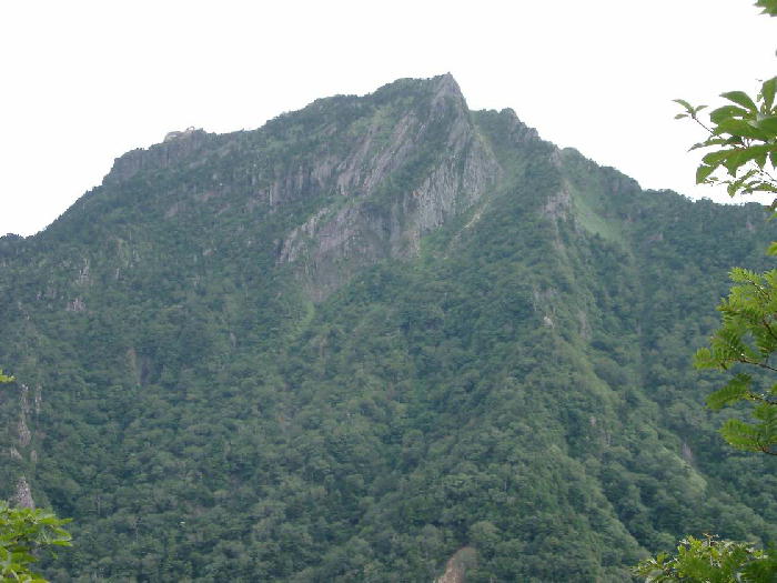 | 面河尾根取付の登山口に戻り、気持ちを切り替え6:30出発。愛大小屋までは、朽ちて落ちる寸前の木橋が何ヶ所かあるもののササはきり払われ歩きやすい。 標高約1600mの愛大小屋に9:15到着。上空は既に雲に覆われてきたが今の所視界良好、正面に面河谷を挟んで石鎚山本体が上部に幕岩と呼ばれる岩壁をまとって面河尾根に対峙している。 |