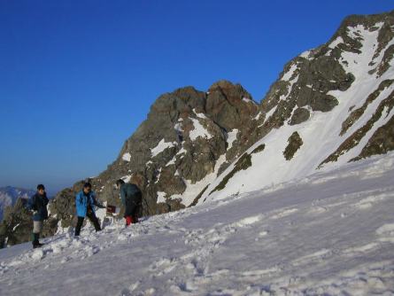 | 雪の消えたコルはさわやかな春風が通り抜け、汗ばんだ皮膚を清浄してくれる。長居したいが先が長い。行くか!9:00出発。 ゆっくりしたペースで雪壁に取り付く。幸い先行者のトレールがあり少しばかり楽をさせてもらう。尾根に出、左にとって小窓ノ王岩壁直下まで進む。メンバーの1人が体調よくなさそうなので大休止。 |