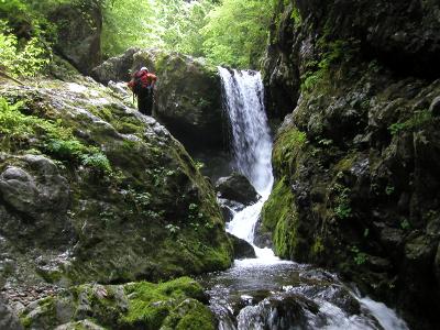 | 水量は資料の記録の時より多いようでF2は3条、と記載されているが全面に落ち1条になっている。それぞれの滝を忠実に直登すればそれなりに時間がかかるだろうが、今回はザイル出さない程度で、できるだけ水流に沿って遡行する。 |