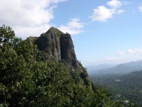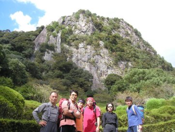 | 御船山: 十数年ぶりに訪れました。岩壁は昔のままでしたが、草も多く当たり前のことですがブッシュが大きくなっており以前よりうるさくなっています。公園の門番のオジサンの話では、最近は人気がないそうで、みんな比叡山に行きよる、といっておりました。仕方ないですねえ、正直言って比叡山とは競争になりませんワ。でもここは高度差は、100m近くあり西九州では大きな岩壁です。ルート中、古い残置ハーケンもありますが、必要なポイントはボルトが打ちかえられており地元クライマーによって手入れされているようです。 |