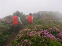 ・霧雨の中を出発、途中から曇空、7合目から山頂にかけて ミヤマキリシマが咲き乱れていました。 今年は普賢岳・中岳・由布岳とミヤマキリシマを満喫しました。 |