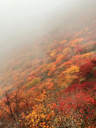 ■2022.10.22-23: 紅葉のくじゅう連山 【参加者:中原】 大船山と三俣山の紅葉の日時のタイミングはほぼドンピシャリだったのではなかろうか。 素晴らし紅葉の連続だった。 初日は久住山~稲星山~白口山~立中を経て大船山を周回して坊ガツルでテント泊。 二日目は坊ガツルから三俣山南峰を直登。途中、沢筋に入ってしまいルートから外れ てしまったので、藪漕ぎを強いられ時間ロスが発生した。 南峰に到着した時点でもガスで視界が全くきかないので、大鍋・小鍋のお鉢廻りは断念したが、本峰に到着したところで、やっとガスはとれ大鍋の綺麗な紅葉が観られた |