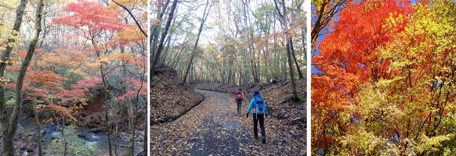 ■2022.10.23: 五色沼 【参加者:岡村眞由美・繁雄】 行 程:裏磐梯ビジターセンター〔バス移動〕→裏磐梯高原駅→柳沼→弁天沼→赤沼→毘沙門沼→裏磐梯ビジターセンター 行動時間:1時間30分 昨日は、雨模様であったため裏磐梯ビジターセンターで長靴〔\500〕を貸し出してもらい出発。 前回は、裏磐梯ビジターセンターからスタートしましたが今回は、始めにバスで移動して逆コースの 裏磐梯高原駅からスタートしました。 前回は、小雨の中廻りましたが、今回は、時折日が差す条件で各池の色が独特で前回とは全く異なりいい感じで、基本下りで楽に回ることが出来ました。 【写真右】:青沼 【写真下】:柳沼 |