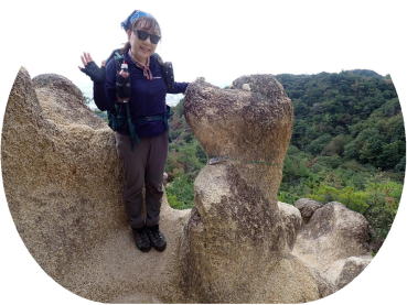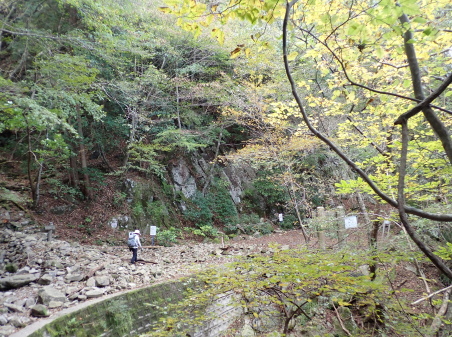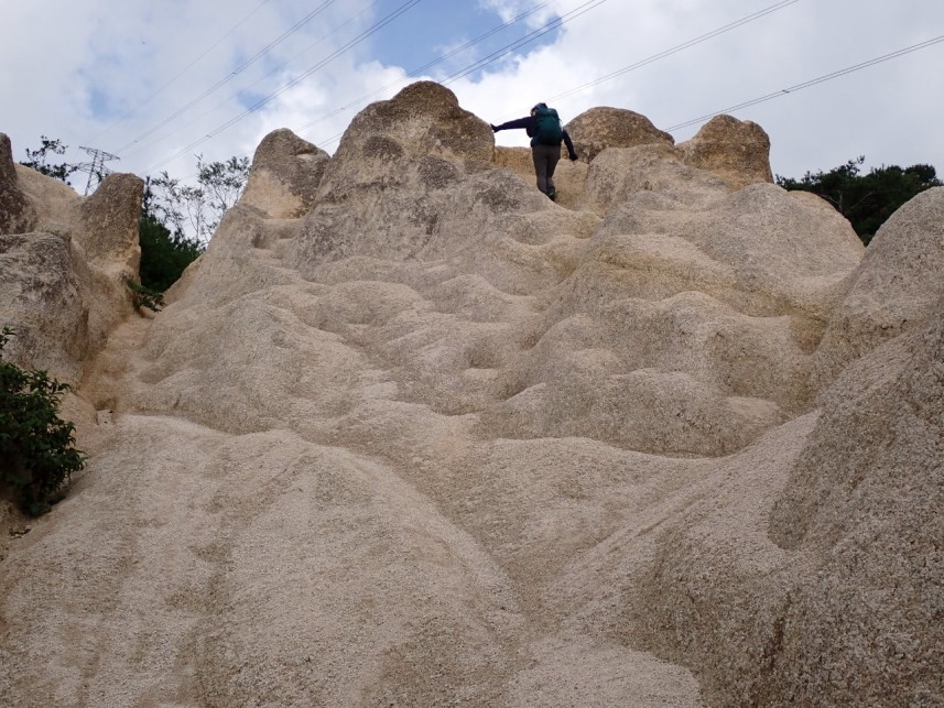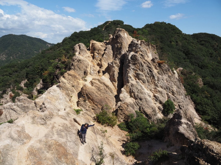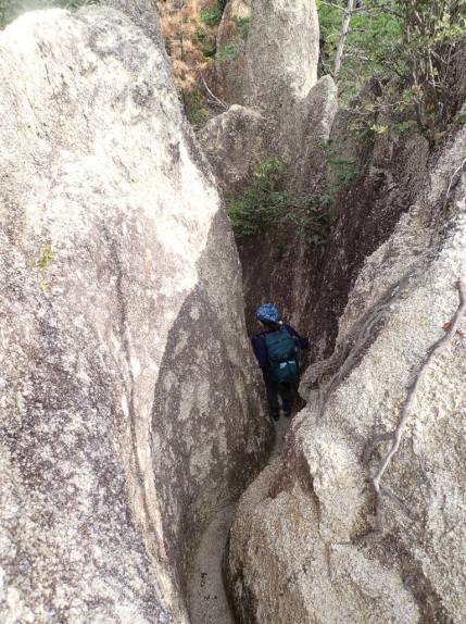 ■2025.10.01: 六甲山地:地獄谷経由東お多福山 【参加者:岡村眞由美・繁雄】 ●コース:芦屋川駅→大座ノ滝→地獄谷→B懸尾根→風吹岩→雨ヶ峠→東お多福山→東お多福山登山口バス停●兵庫県在住、吉村さんの推薦コースです。 大座ノ滝より階段を登って尾根から一般ルートは、尾根伝いに中央稜を行くが、ここから地獄谷に降りて沢歩き。 数ヶ所小さく高巻いて沢沿いを進み防波堤より左岸を尾根へ登るが、ステップが彫ってあるため迷うことはない。 B懸尾根に出て独特の岩峰を、一つずつ登り下りを繰り返して岩峰をほとんど忠実に進んだため思った以上に時間を要してしまった。 変化に富んで楽しめるルートですが、簡単なクライミング要素とやや不明朗な個所があるため、初心者にはお勧めしません。 【写真右】B懸尾根 スヌーピー岩 |