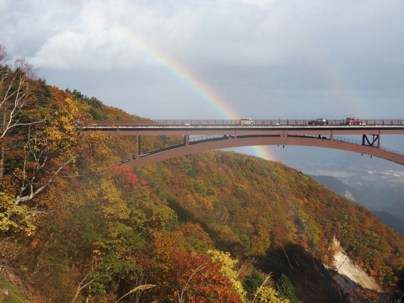 | 磐梯吾妻スカイラインカの不動沢橋/つばくろ谷の展望台よりの紅葉とダブルレインボー |