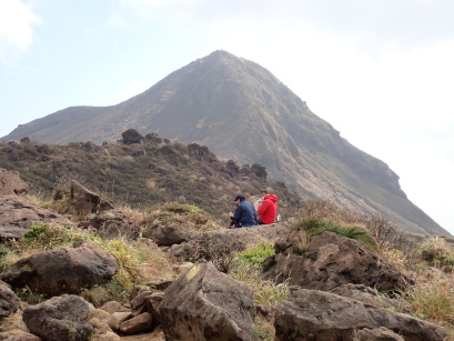 | 黒岩山の登り(後方に阿蘇山を望む) | 黒岩山 山頂(後方 三俣山) |