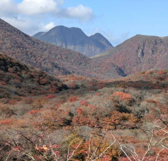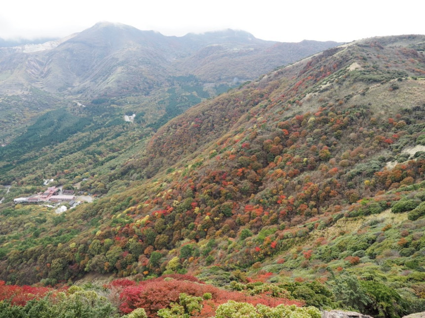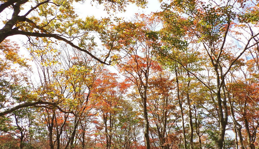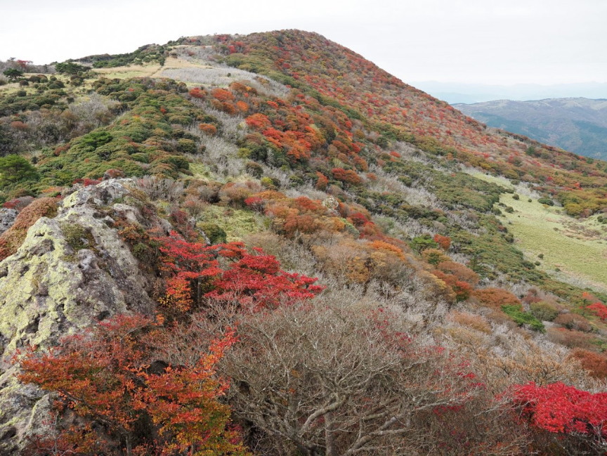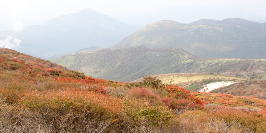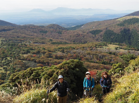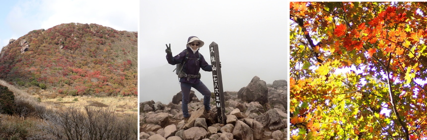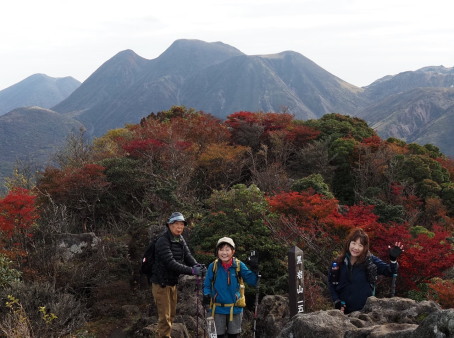 | ■2025.11.04: 黒岩山・泉水山 【参加者:三栗、毛利眞、岡村眞由美・繁雄】 九重町コミュニティバス(長者原8:26 ⇒ 牧ノ戸峠)\500 で、牧ノ戸峠から出発。 津行さん宅へ新米の受け取りかたがたに、天候の良い日を選定し、黒岩山⇒泉水山⇒長者原のコースを3時間30分のゆったり行程で、楽しんできました。 曇りで太陽の陽ざしがあれば、より紅葉も浮き立って見えたのですが、それでも周辺の斜面はまずまずの紅葉でした。 |