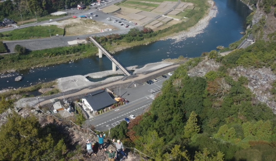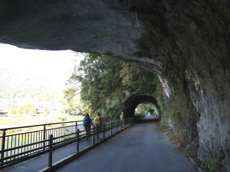 ■2025.11.08: 青の洞門・競秀峰 【参加者:三栗、毛利眞、岡村真由美・繁雄】 所々に展望の良い箇所があり、途中複数の岩穴を巡り変化に富んだ好ルートでした。 最後に陣の岩でドローンを飛ばし、くつろいで下山。 青の洞門・競秀峰のよく整備された岩山を周回、 ドローン飛行操作時間を除いて、 ゆったり散策で2時間弱のショートコースでした。 【写真右】 陣の岩と後方 公共駐車場と山国川 〔毛利さんによるドローン撮影〕 |